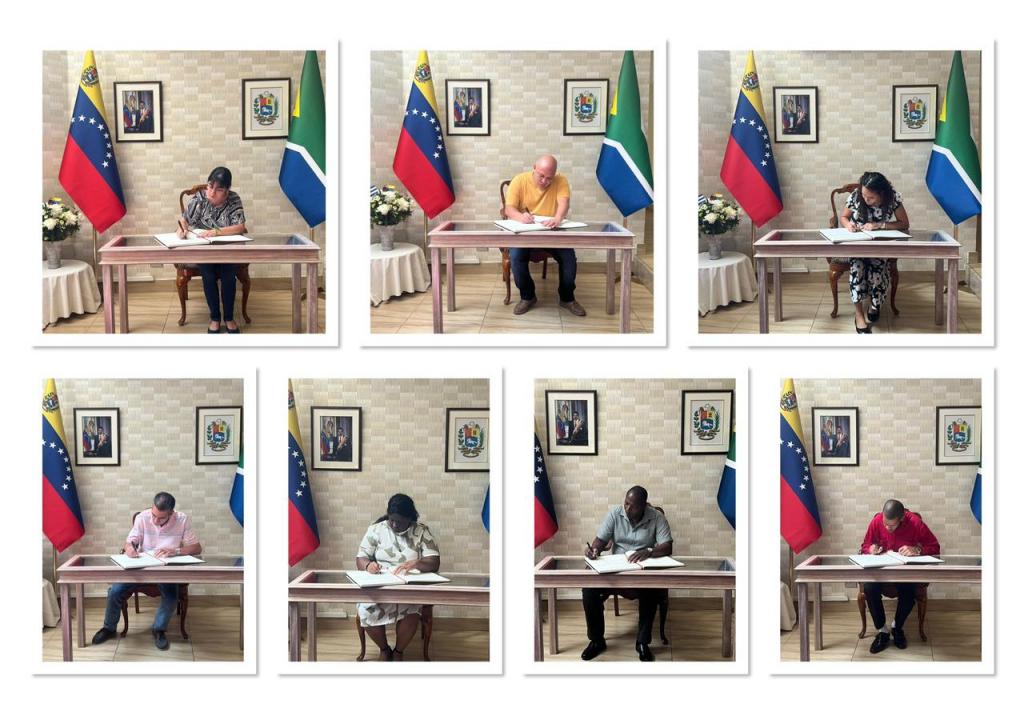 Pretoria, 12 de enero de 2026.- En la mañana de hoy, la misión diplomática cubana en Sudáfrica, visitó la embajada de la hermana República Bolivariana de Venezuela y firmó el libro de condolencias que rinde tributo a los héroes cubanos y venezolanos caídos durante la vil agresión imperialista del pasado 3 de enero en Caracas.