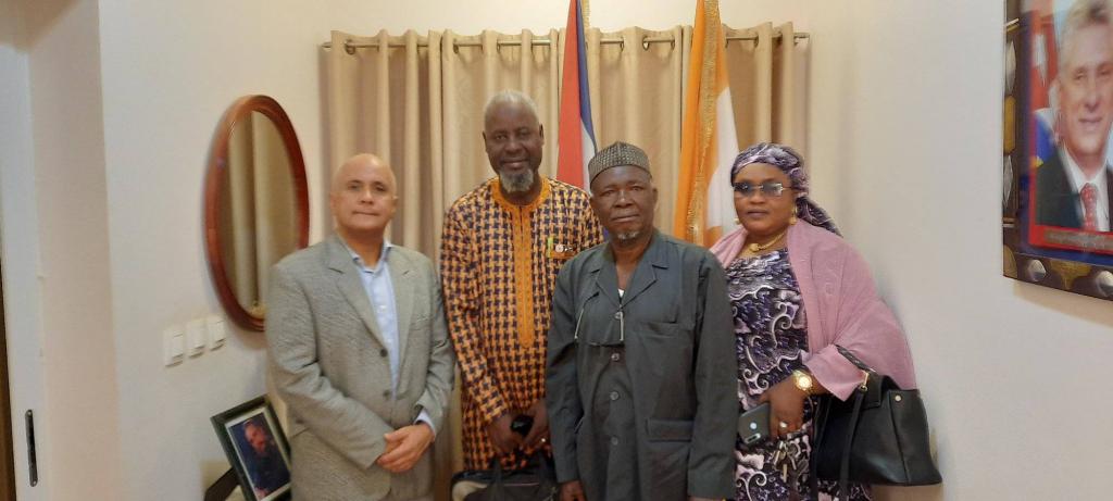 Niamey; 3 de noviembre, 2017. El embajador der Cuba en Niger, Jorge José Hadad Capote sostuvo un excelente encuentro de actualización de la campaña mundial contra el bloqueo con los sindicalistas amigos de Cuba, Sr. Abdoulaye Hamidou, Secretario General de FSM-Niger, la Sra. Zeinabou Abdou, secretaria General encargada de la seción femenina de la FSM-Niger y con el Sr. Ibrahim Hamadou, coordinador nacional de la FSM-Niger, con quienes conversó sobre los efectos y cuantiosas pérdidas para Cuba por causa de la intensificada política de cerco económico contra la Mayor de las Antillas.