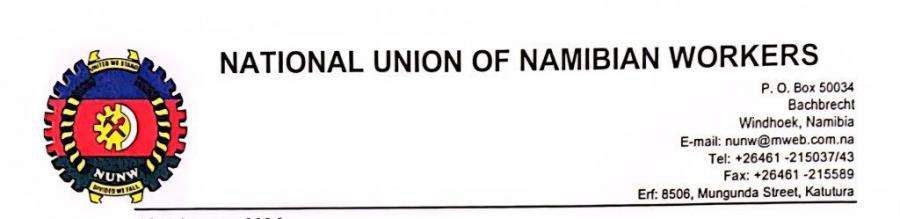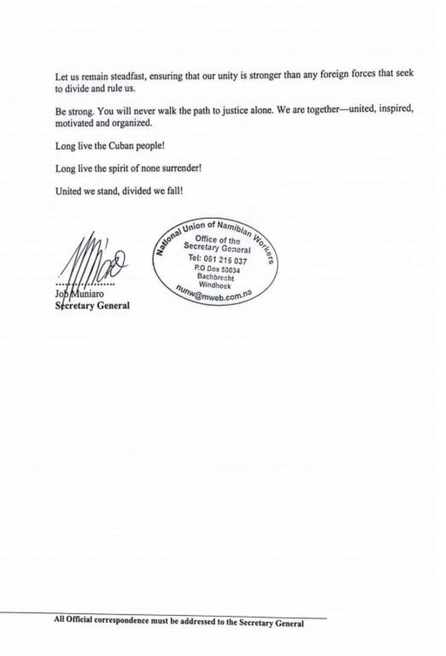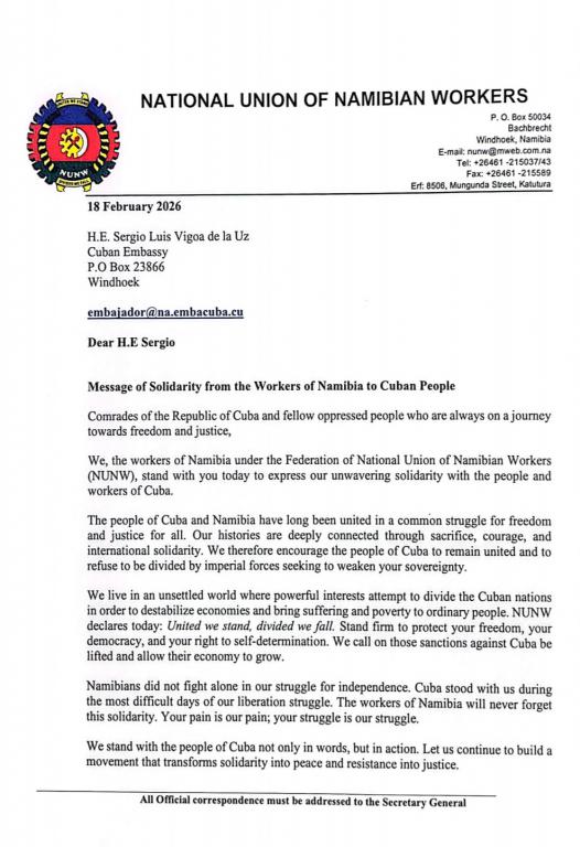 Nosotros, los trabajadores de Namibia, bajo la Federación del Sindicato Nacional de Trabajadores de Namibia (NUNW), nos unimos a ustedes hoy para expresar nuestra inquebrantable solidaridad con el pueblo y los trabajadores de Cuba.