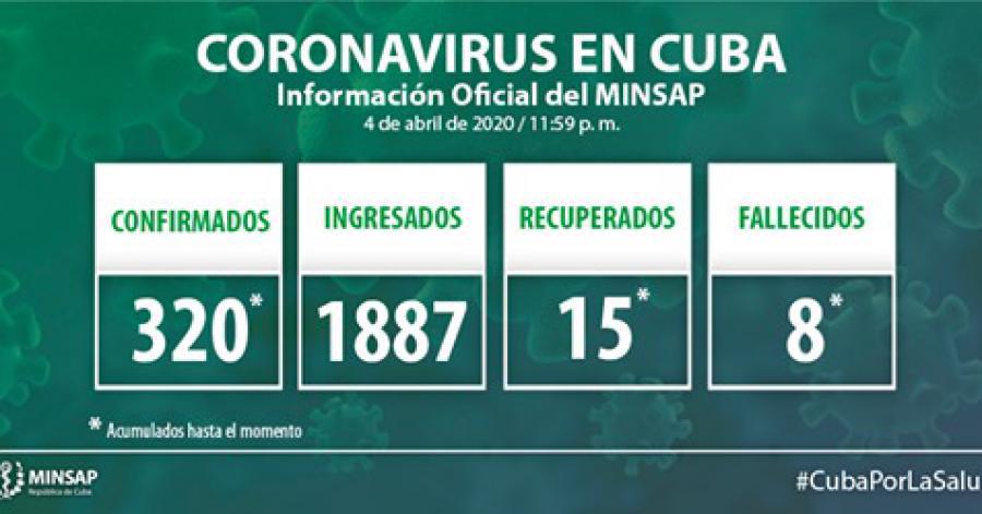 Al cierre del día 4 de abril, en Cuba se encuentran ingresados mil 887 pacientes, de ellos mil 291 sospechosos y 295 confirmados. Otras 16 mil 306 personas se vigilan en sus hogares, desde la Atención Primaria de Salud.