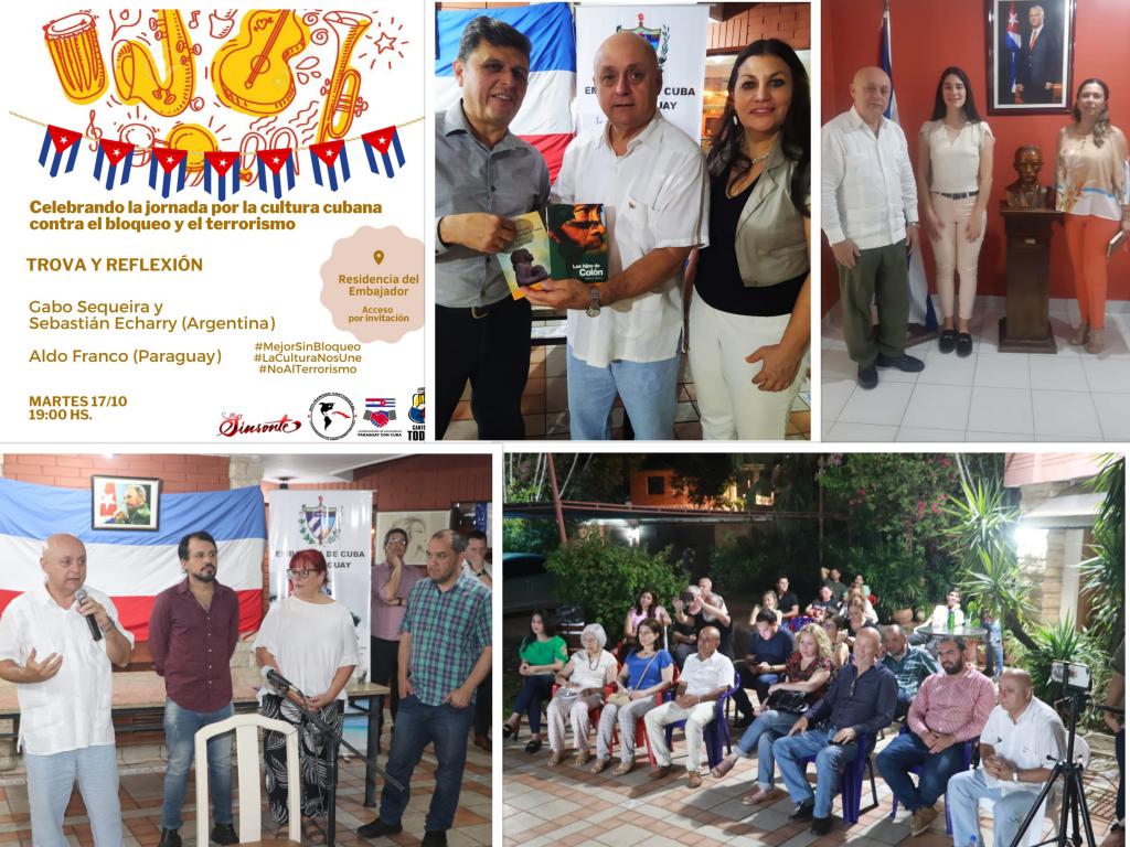 Asunción, 18 de octubre de 2023. El presidente de la Sociedad de Escritores del Paraguay (SEP), Marcos Ibáñez, acompañado por directivos del Centro Cultural Punto Divertido, Celeste Galeano, y Oriana Olivares del grupo editorial Librería de la Paz, accionaron colectivamente en representación de unos 300 autores paraguayos para sumarse a la jornada mundial por el millón de firmas que exige al presidente de los EEUU excluir a Cuba de la lista terrorista. En una simbólica velada cultural, junto a trovadores argentino-paraguayos del Movimiento Canto de Todos convocados por la Coordinadora de Solidaridad Paraguay-Cuba, compartieron reflexiones por el cese del bloqueo imperialista contra la Revolución Cubana.
