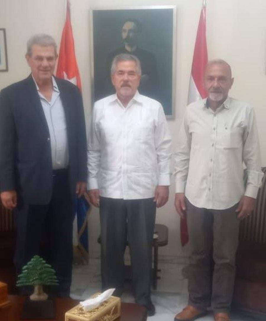 El secretario general del Partido Voz del Pueblo y representante del Frente Progresista Árabe del Líbano, Najah Wakim y el secretario general del Partido Democrático Popular de Líbano, Mohammad Hachicho, fueron recibidos en la sede de la Embajada de Cuba en Beirut por el embajador Jorge León Cruz.