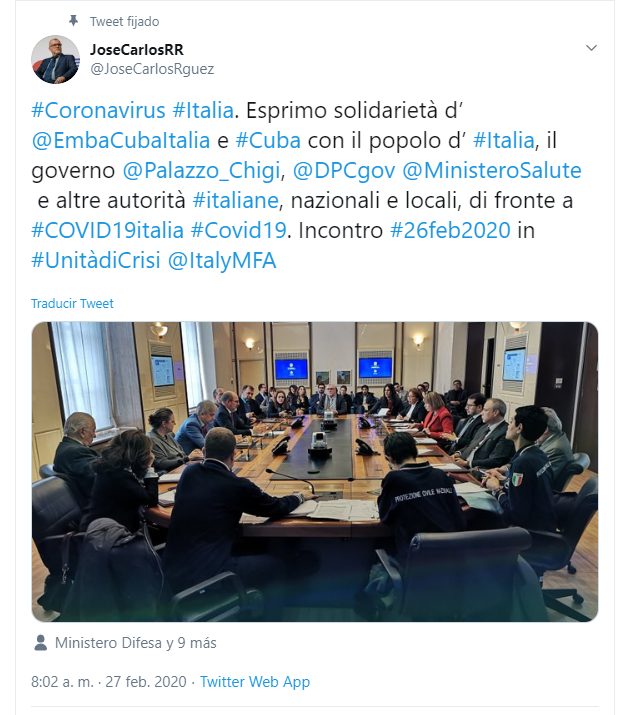 Roma, 27 de febrero. El Embajador cubano en Roma, José Carlos Rodríguez Ruiz, expresó, a través de su cuenta oficial en Twitter @JoseCarlosRguez, la solidaridad de Cuba y de la misión diplomática de este país con el pueblo y las autoridades nacionales y locales que hacen frente al Coronavirus en Italia, desde el pasado 21 de febrero, cuando se hizo público el primer caso positivo, en la región de la Lombardía.