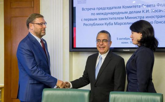 RUSIA, 8 de octubre de 2018.- La Cámara alta del Parlamento ruso o Consejo de la Federación, fue sede en la tarde del viernes último, del encuentro entre el viceministro primero del MINREX de Cuba Marcelino Medina González, y el presidente del Comité de Asuntos Internacionales de ese órgano legislativo, Konstatin Kosachov.