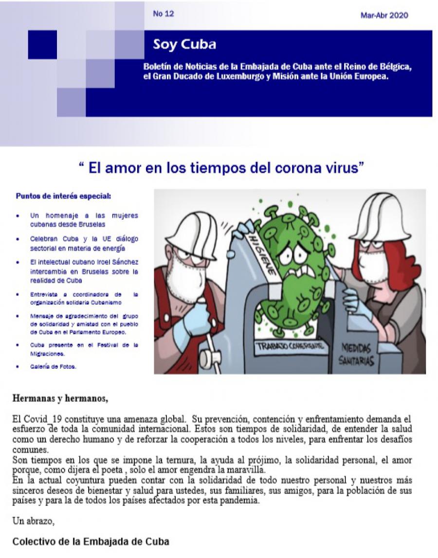 Ponemos a su disposición el No.12 del Boletín de Noticias de la Embajada de Cuba en el Reino de Bélgica, el Gran Ducado de Luxemburgo y Misión ante la Unión Europea, este boletín corresponde a los meses de marzo y abril de 2020. Esperamos les resulte de agrado y utilidad.