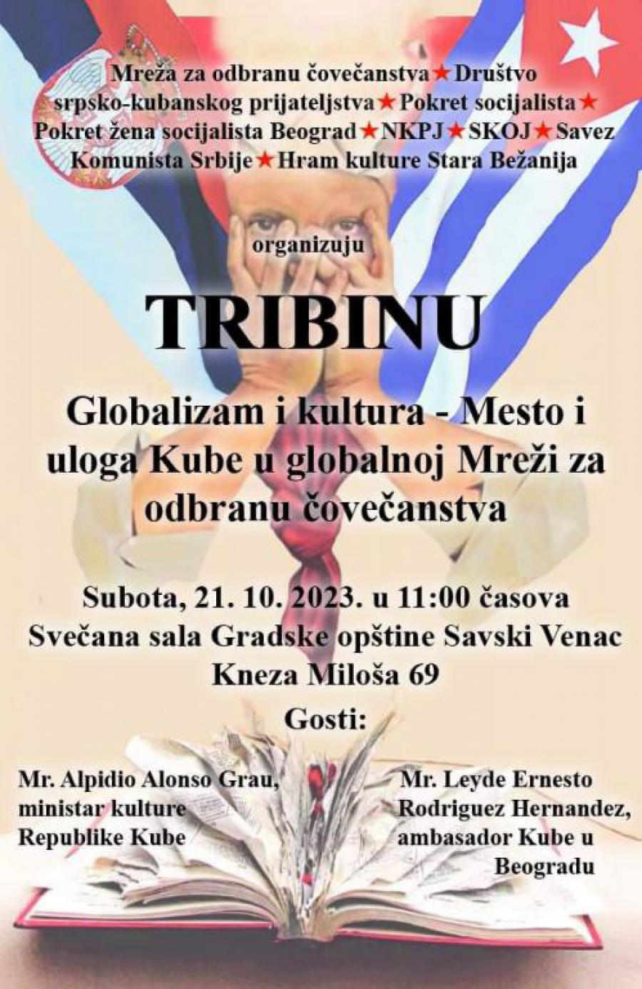 Belgrado, 25 de octubre de 2023. Con motivo del Vigésimo Aniversario de la creación de la Red de Intelectuales y Artistas en Defensa de la Humanidad, por los Comandantes Fidel Castro y Hugo Chávez, el sábado 21 de octubre, se celebró la Tribuna “Globalismo y Cultura-lugar y papel de Cuba en la Red, con la presencia del Ministro de Cultura de Cuba, Alpidio Alonso Grau, y el Embajador Leyde Ernesto Rodríguez Hernández, en la sala de ceremonias de la Asamblea Municipal de Savski Venac, en esta capital.