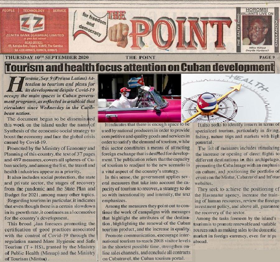 Banjul, 10 sept.- El influyente diario gambiano The Point destaca hoy en su edición impresa que la atención al turismo y a la salud ocupan los principales espacios de los programas gubernamentales de desarrollo de Cuba.