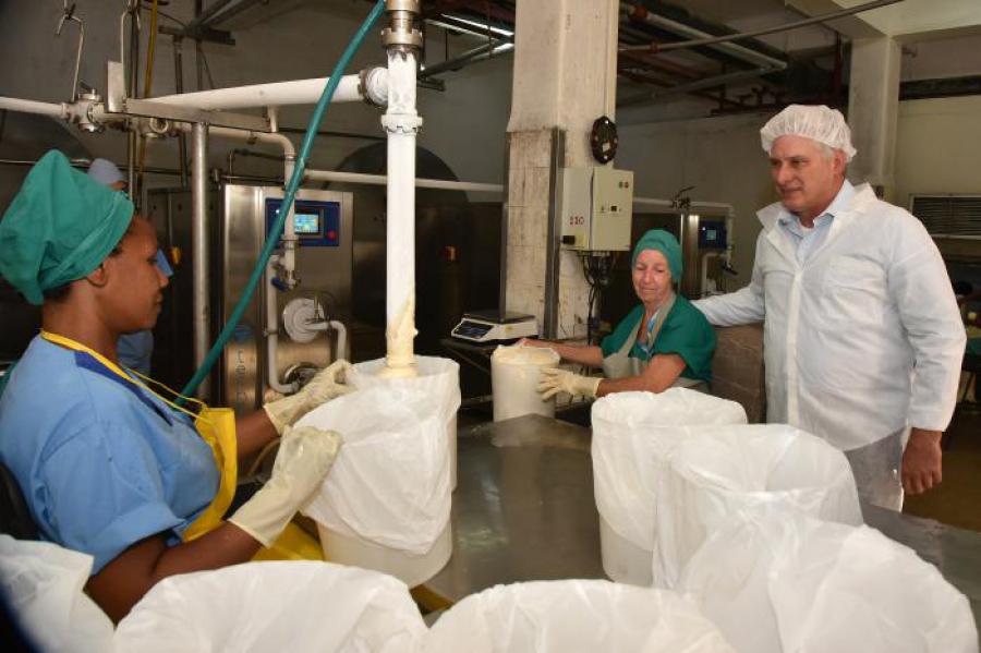 Acompañado por Iris Quiñones Rojas, ministra de la Industria Alimentaria; Alejandro Gil Fernández, titular de Economía y Planificación; y los máximos dirigentes del Partido y el Gobierno en la capital, Díaz-Canel recorrió áreas de la fábrica donde pudo apreciar diferentes fases del proceso productivo.