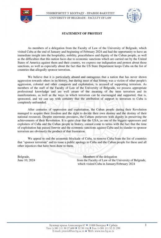 Como miembros de una delegación de la Facultad de Derecho de la Universidad de Belgrado, que visitó Cuba a finales de enero y principios de febrero de 2024 y tuvo la oportunidad de tener una visión inmediata de la hospitalidad, la nobleza, la tranquilidad y la dignidad del pueblo cubano, así como las dificultades que enfrenta esta nación debido a las sanciones económicas que lleva a cabo Estados Unidos América contra el pueblo y su país, expresamos nuestra indignación y protesta por aquellas sanciones, así como especialmente sobre el hecho de que el Departamento de Estado de Estados Unidos mantiene a Cuba en la lista de países que supuestamente patrocinan el terrorismo.