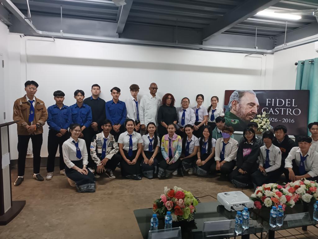 La Embajadora cubana Enna Viant Valdés y el profesor de español que brinda sus servicios como colaborador Luis Mario Zamora, argumentaron en las intervenciones, la vasta obra de Fidel Castro en el campo de la educación siguiendo los principios del Héroe Nacional José Martí, y en particular la expresión de esas ideas en el desarrollo de la cooperación bilateral, de la cual se ha beneficiado Laos, país que ha graduado mas de un centenar de estudiantes en universidades y centro de enseñanza técnica en la isla.