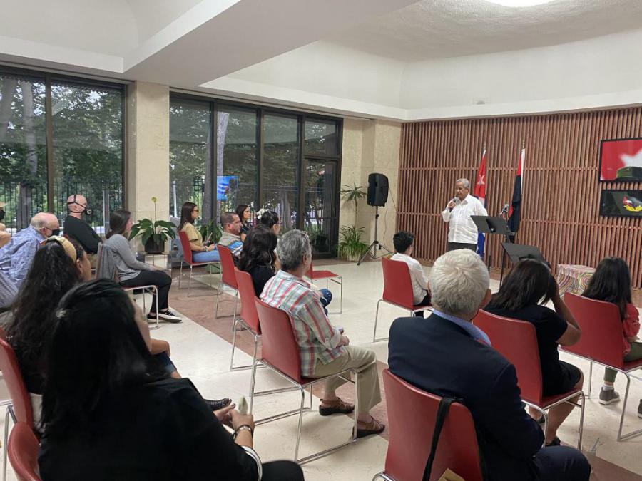 Entre canciones y poesía se realizó una velada político-cultural en la sede de la Embajada de Cuba en Canadá. A la misma asistieron amigos, cubanos residentes en Canadá, representantes de las organizaciones Ottawa-Cuba Connections, Association d’Amitié Outaouais-Cuba y miembros del colectivo de la misión cubana en Ottawa.