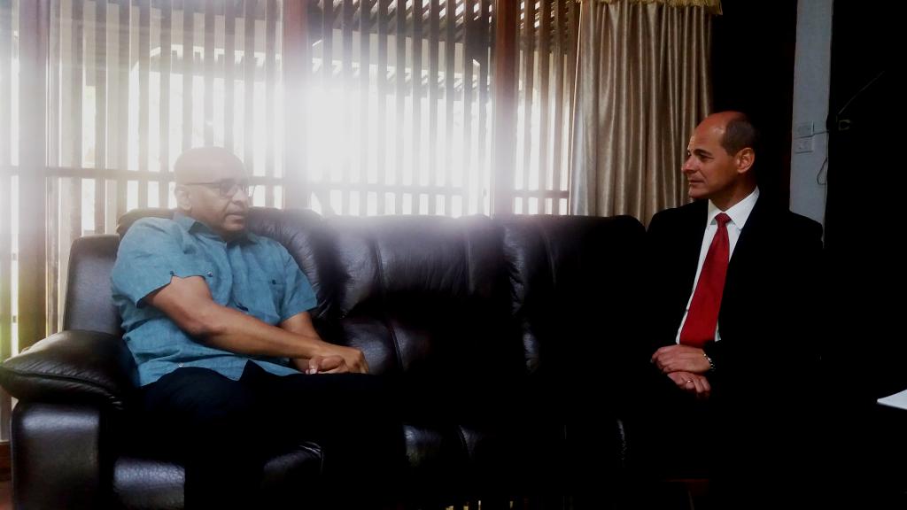 Georgetown, 13 de junio de 2018. El Hon. Bharrat Jagdeo, Secretario General del People´s Progressive Party y Miembro del Parlamento, recibió este miércoles en su despacho personal al Viceministro de Relaciones Exteriores de Cuba, Rogelio Sierra Díaz, quien realiza una visita a Guyana con el objetivo de fortalecer y ampliar las relaciones bilaterales entre las dos naciones caribeñas.