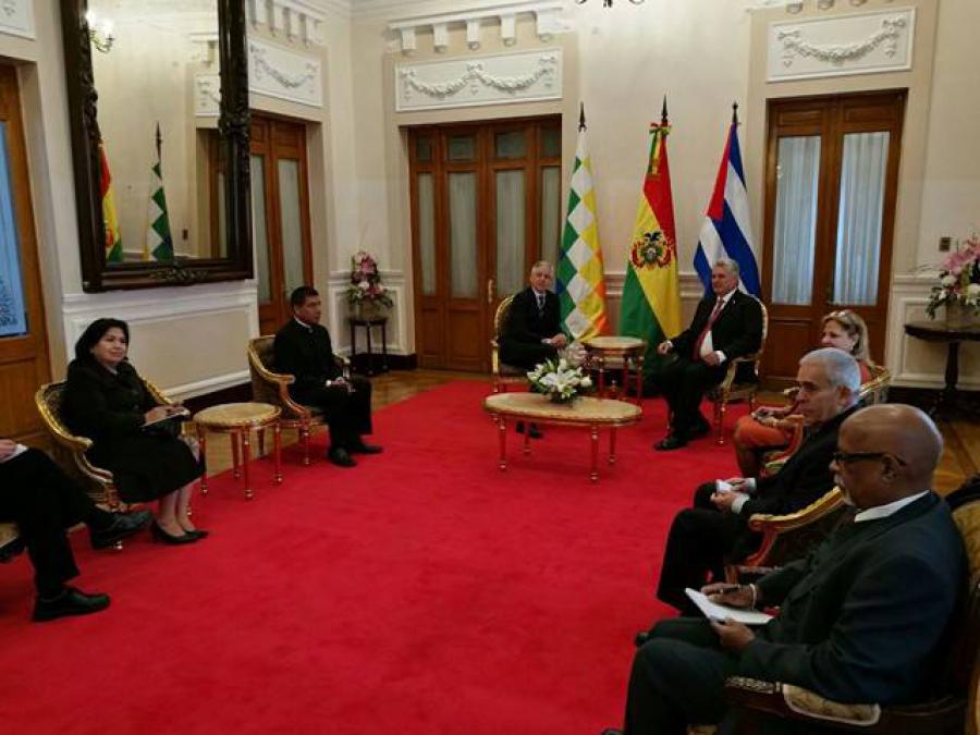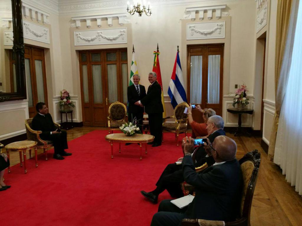 Díaz-Canel agradeció el apoyo de la Vicepresidencia a las actividades desarrolladas en Bolivia en conmemoración de los 50 años de la presencia del Che en esta nación suramericana. Al concluir el encuentro, el Primer Vicepresidente cubano ofreció una conferencia de prensa.