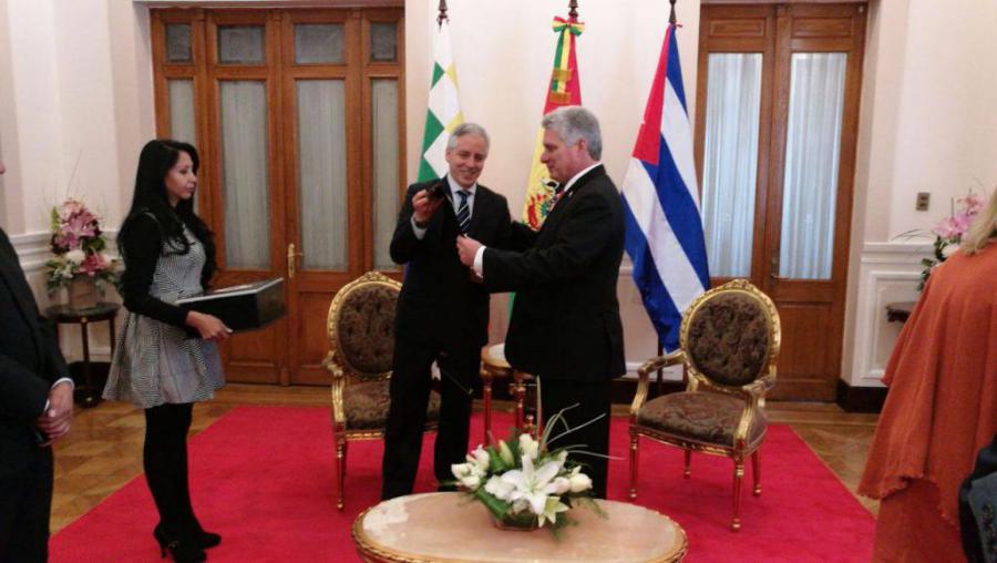 La Paz, Bolivia, 26 de mayo de 2017.- El Vicemandatario del Estado Plurinacional de Bolivia, Álvaro García Linera, dialogó este viernes en el Palacio de Gobierno con el primer vicepresidente de los Consejos de Estado y de Ministros de Cuba, Miguel Díaz-Canel Bermúdez, quien realiza una visita oficial a esta nación suramericana.