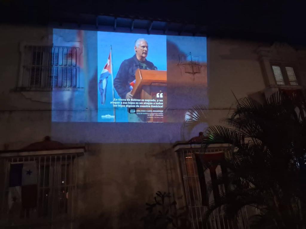 Ciudad de Panamá, 19 de febrero de 2026. En la noche de este jueves, miembros de la Misión Estatal de Cuba en Panamá junto a cubanos residentes y amigos solidarios, condenaron el bloqueo genocida impuesto por Estados Unidos contra Cuba de una manera diferente, con la proyección de imágenes y videos en la fachada de la sede diplomática. Los colores de la bandera cubana iluminaron la fachada para denunciar la orden ejecutiva de Trump.