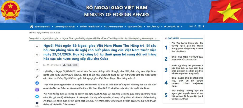 El 2 de febrero de 2026, en respuesta a la pregunta de un periodista sobre la reacción de Vietnam al anuncio de Estados Unidos, el 29 de enero de 2026, de aranceles adicionales sobre los productos de los países que suministran petróleo a Cuba, la portavoz del Ministerio de Asuntos Exteriores de Vietnam, Pham Thu Hang, declaró: