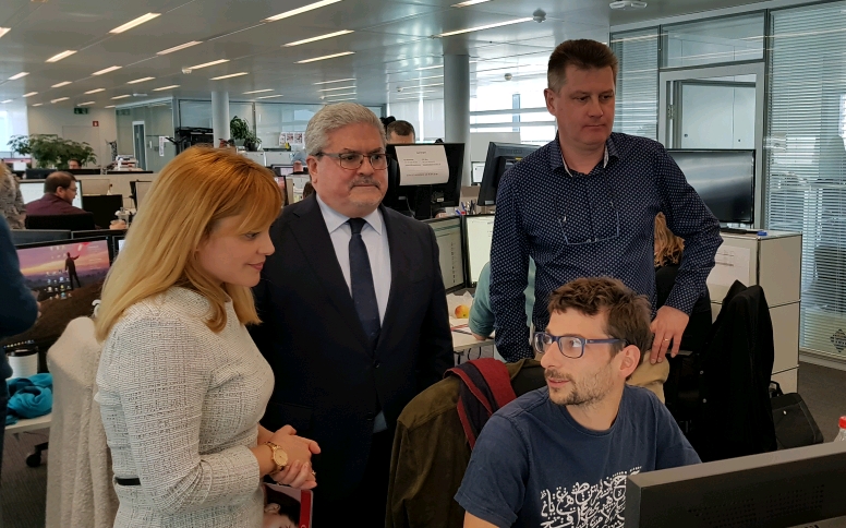 Lausana, 5 de marzo de 2019.- El Embajador de Cuba en Suiza, Manuel Aguilera de la Paz, realizó una visita a la sede de la redacción de la edición en francés del diario suizo "20 Minutos", donde fue recibido por Simon Koch, Responsable de Comunicación para la Suiza francófona del Grupo Tamedia y el Redactor Jefe de "20 Minutos", Philippe Favre, quienes brindaron una amplia y detallada información sobre el Grupo Tamedia, principal empresa privada suiza de medios de comunicación, que edita numerosos diarios y revistas en formatos impreso y digital en los tres idiomas más hablados en este país: alemán, francés e italiano. “20 Minutos” se edita de lunes a viernes en formato impreso y se distribuye de forma gratuita, también se edita en formato digital todos los días y según las empresas encuestadoras especializadas, es el periódico más leído en Suiza.