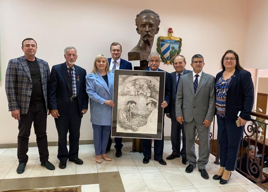 “Un muy esperado encuentro”, según las palabras de la pintora Victoria Alyabieva, para entregar al Embajador de Cuba en la Federación de Rusia, Julio Garmendia Peña una creación artística concebida el año 2020 en el marco de la celebración en la ciudad de Orenburgo de la teleconferencia con Cuba "Oremburgo- Moscú-Habana- Ciudad de las Estrellas - Centro de Preparación de Cosmonautas Yury Gagarin" con motivo del 40 aniversario del vuelo soviético-cubano al espacio encabezado por Yuri Romanenko, y el copiloto de Arnaldo Tamayo Méndez. Esta importante fecha en nuestra historia bilateral, la sincera relación de hermandad entre el pueblo ruso y cubano, y el libro “Cuba es mi amor” del Vicepresidente del SARC Víctor Shabrin, destacó Victoria, fueron los motivos para su concepción y expresó el deseo de hacerlo llegar a Cuba y entregarlo a Arnaldo Tamayo Méndez.