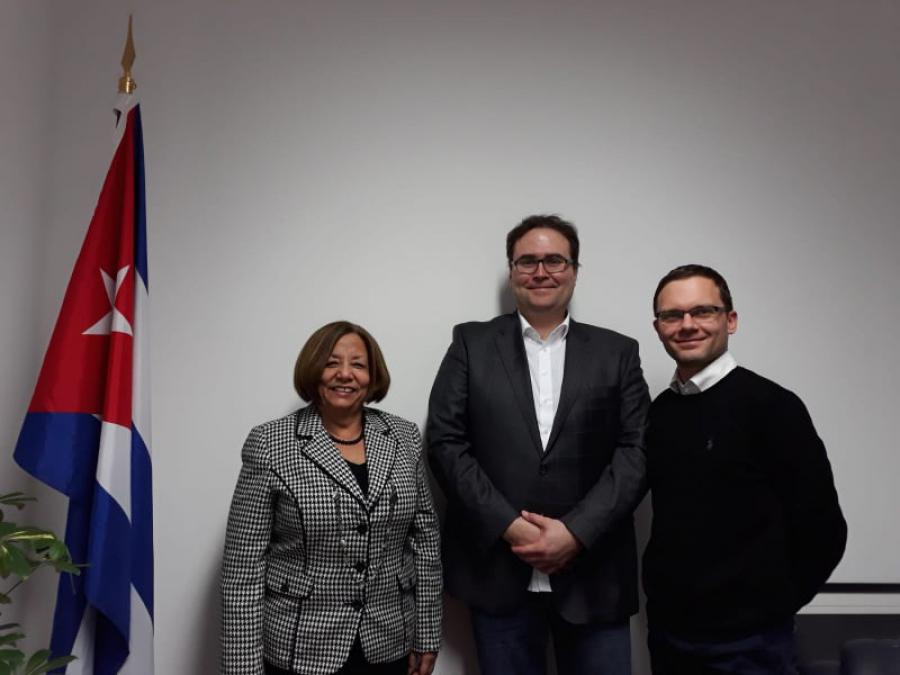 La Consejera de Ciencia e Intercambio Académico Milagros Franco recibió al Dr. Schwurack, acompañado por el especialista Julian Thiele, para ultimar detalles de la coordinación de la visita a Cuba de la delegación del IPF e intercambiar sobre los intereses y oportunidades de cooperación entre ambas Partes.