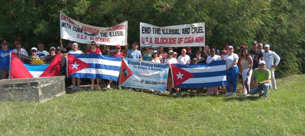 Cubanos residentes en Antigua y Barbuda junto a graduados en Cuba de este país y miembros de las brigadas cubanas de colaboración médica y la UNECA, unieron sus voces este Domingo 27 de Octubre en denuncia del genocida bloqueo que por más de 6 décadas impone el gobierno de Estados Unidos al pueblo cubano y contra la arbitraria inclusión de Cuba en la inmoral lista de países patrocinadores del terrorismo. Con banderas de Cuba y Antigua y Barbuda y pancartas de abajo el bloqueo, una caravana de alrededor de 12 autos se observó en las calles antiguenses este domingo hasta la cercanía de la playa de Jolly Beach, donde se efectuó un emotivo acto de solidaridad con Cuba y de denuncia a la criminal guerra económica del gobierno de Estados Unidos contra Cuba.