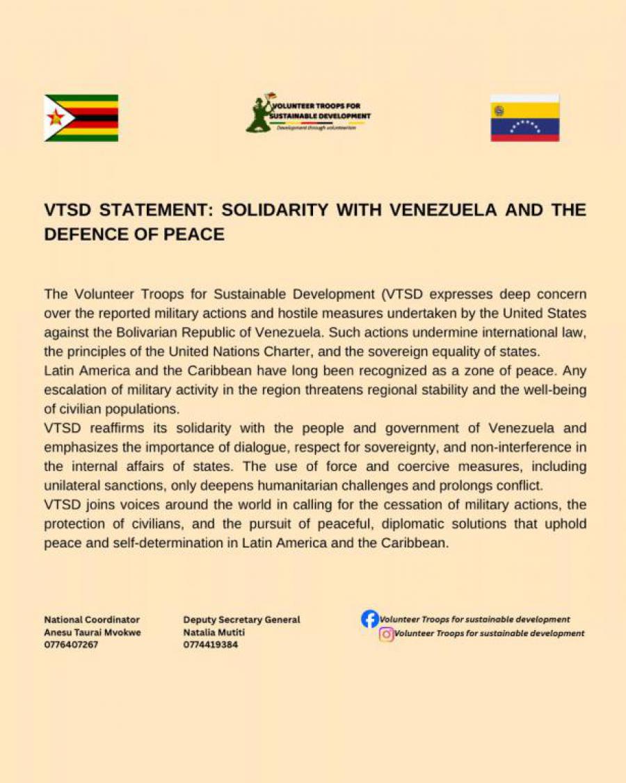 Harare, 4 de enero de 2026- Las Tropas Voluntarias para el Desarrollo Sostenible (VTSD, siglas en inglés) de Zimbabwe expresaron hoy su profunda preocupación por la agresión y las medidas hostiles de Estados Unidos contra Venezuela.