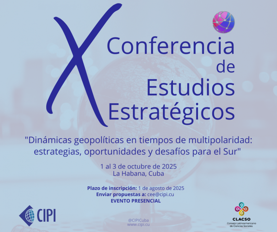 Del 1ro al 3 de octubre de 2025 se desarrollará en La Habana la X Conferencia de Estudios Estratégicos, evento auspiciado por el Centro de Investigaciones de Política Internacional (CIPI) y el Consejo Latinoamericano de Ciencias Sociales (CLACSO).