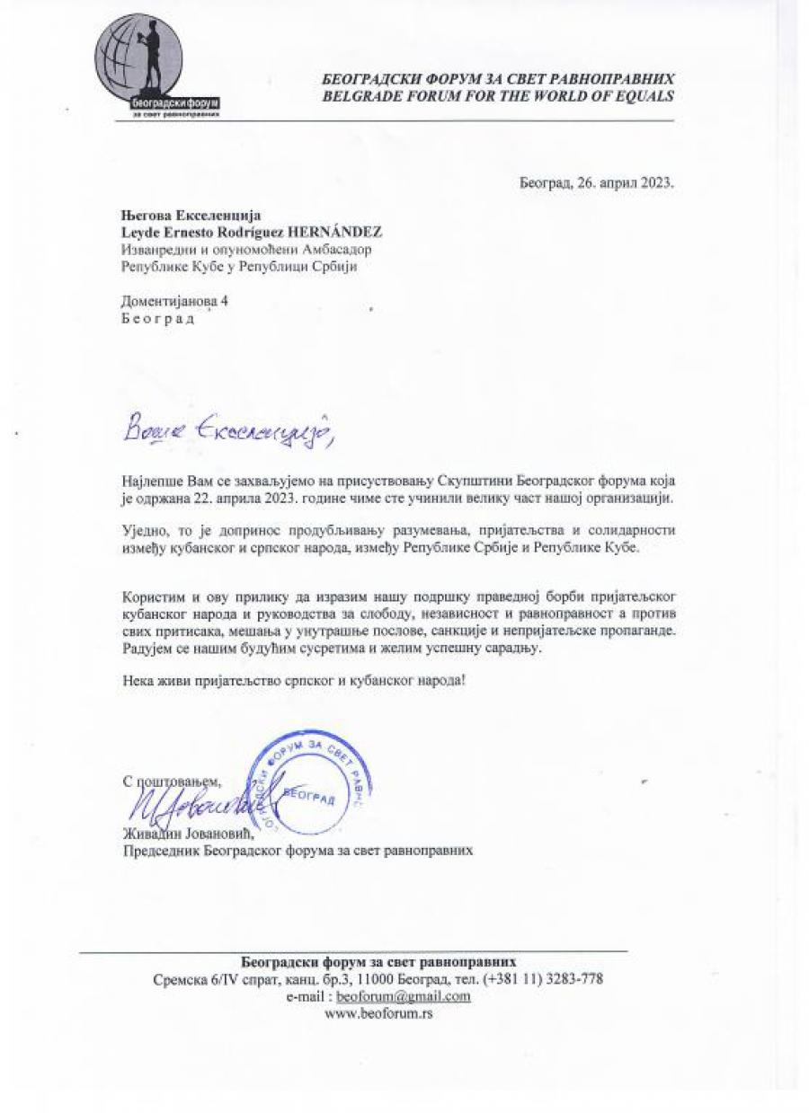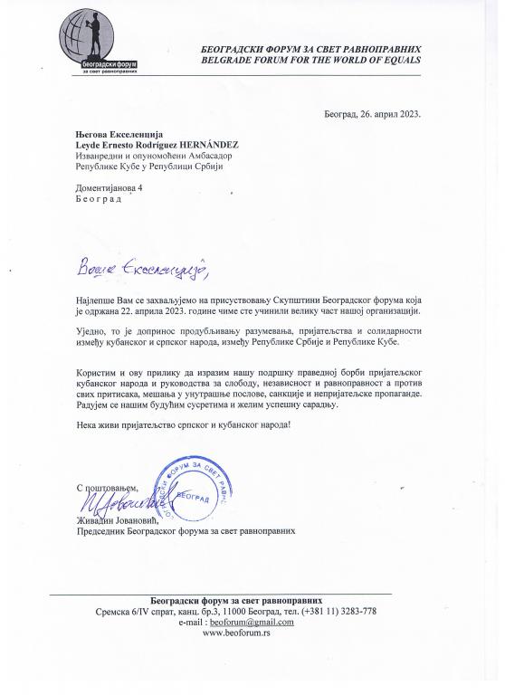 Le agradecemos por su asistencia a la asamblea del Foro de Belgrado que se llevó a cabo el 22 de abril de 2023, en lo cual hizo un gran honor a nuestra organización.