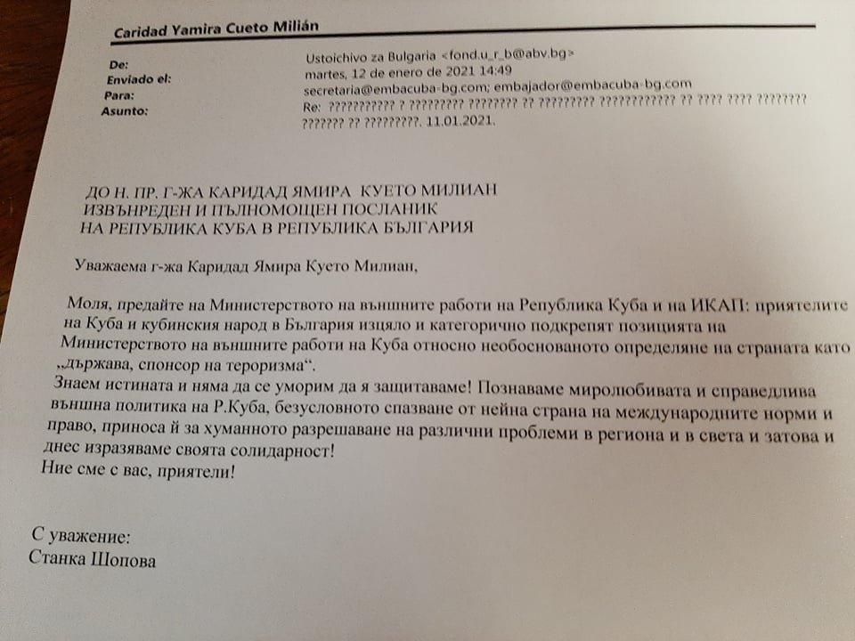 Моля, предайте на Министерството на външните работи на Република Куба и на ИКАП: приятелите на Куба и кубинския народ в България изцяло и категорично подкрепят позицията на Министерството на външните работи на Куба относно необоснованото определяне на страната като „държава, спонсор на тероризма“.
