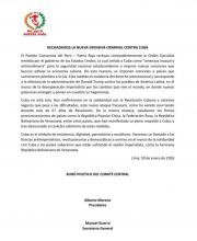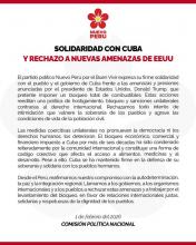 Lima, 2 de febrero. El Partido Comunista del Perú – Patria Roja rechazó contundentemente la Orden Ejecutiva emitida por el gobierno de los Estados Unidos, la cual señala a Cuba como “amenaza inusual y extraordinaria” para la seguridad nacional estadounidense e impone nuevas sanciones que buscan asfixiar la economía cubana. El partido político peruano señaló que esta medida viola el derecho internacional y corresponde a la ofensiva estadounidense contra los pueblos de Nuestra América. El comunicado ratifica, además, la solidaridad con la Revolución Cubana y la seguridad de que, "pese a las dificultades, este nuevo ataque fracasará, como ha venido ocurriendo durante más de 67 años de Revolución". Concluye el comunicado expresando: "Cuba es el símbolo de resistencia, dignidad, patriotismo y socialismo. Hacemos un llamado a las fuerzas antiimperialistas, revolucionarias y democráticas a unirnos en el marco de la solidaridad con Cuba y los países soberanos que están sufriendo el asedio imperialista, como la hermana República Bolivariana de Venezuela".