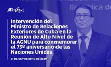 La Habana, 17 de septiembre de 2020. – El Ministro de Relaciones Exteriores de Cuba, Bruno Rodríguez Parrilla, intervendrá el próximo 21 de septiembre en el evento de alto nivel, que de manera virtual se desarrollará para conmemorar el 75 aniversario de las Naciones Unidas.