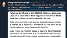 Al intervenir en la sesión de clausura de la cita, con sede en el Centro de Convenciones de Buenos Aires, el jefe de la delegación de la isla caribeña, el ministro de Comercio Exterior, Rodrigo Malmierca, reiteró el irrestricto apoyo de su país a la Revolución Bolivariana y su presidente constitucional Nicolás Maduro.