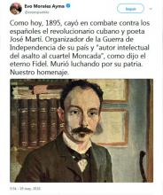 “Como hoy, 1895, cayó en combate contra los españoles el revolucionario cubano y poeta José Martí. Organizador de la Guerra de Independencia de su país y 'autor intelectual del asalto al cuartel Moncada', como dijo el eterno Fidel. Murió luchando por su patria. Nuestro homenaje”, publicó el mandatario en la red social Twitter. (EmbaCuba Bolivia)