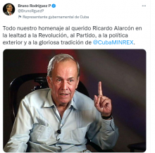 En Twitter, el miembro del Buró Político y ministro de Relaciones Exteriores, Bruno Rodríguez Parrilla, escribió: «Todo nuestro homenaje al querido Ricardo Alarcón en la lealtad a la Revolución, al Partido, a la política exterior y a la gloriosa tradición de @CubaMINREX».