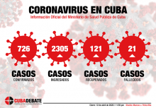 Con la confirmación al cierre del domingo 12 de abril de 57 nuevos casos con la COVID-19, Cuba alcanza la cifra de 726 pacientes positivos a la enfermedad causada por el coronavirus SARS-CoV-2, informó esta jornada el doctor Francisco Durán García, director nacional de epidemiología del Ministerio de Salud Pública.