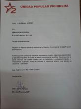 Pronunciamiento de solidaridad de la Directiva de la Unidad Popular en Pichincha.