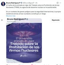 La Habana, 22 de enero de 2026. Bruno Rodríguez Parrilla, ministro de Relaciones Exteriores de Cuba, destacó hoy en la red social X la urgencia del desarme nuclear, al cumplirse cinco años de la entrada en vigor del Tratado sobre la Prohibición de Armas Nucleares (TPAN).