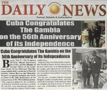 Con llamado a portada, el diario Daily News resalta hoy mensajes de felicitación enviados por el presidente de Cuba, Miguel Diaz-Canel, y el canciller de la isla caribeña, Bruno Rodríguez Parrilla, a sus respectivos homólogos de Gambia, Adama Barrow y Mamadou Tangara, en ocasión del 56 aniversario de la Independencia de esta nación del occidente africano.