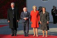 El presidente cubano Miguel Díaz-Canel Bermúdez y su esposa Lis Cuesta son recibidos por el mandatario irlandés Michael Higgins y su esposa Sabina, a la entrada de la casa presidencial de Áras an Uachtaráin, un palacio ubicado al norte de Dublín.