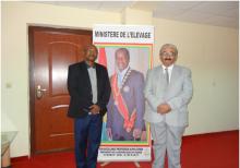 El Ministro de Ganadería y Alimentación del Ganado de la República de Guinea, Sr. Roger Parick Millimouno al Embajador de la República de Cuba en Conakry, Sr. Roberto Rodríguez Peña. En el encuentro participaron además el Secretario General del Ministerio (VM), el Asesor Principal del Ministro, Responsable de la Alimentación del Ganado, el Responsable Nacional de la Producción Avícula y el Responsable Nacional de Veterinaria, los tres graduados en Cuba.
