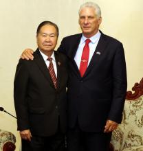 Vientiane, 7 de septiembre de 2025. Un emotivo y amistoso encuentro del presidente cubano tuvo lugar con el vicepresidente de la Asamblea Nacional de la RDP Lao, y presidente de la Asociacion de Amistad, AALC, y del Grupo parlamentario de amistad Laos Cuba, companero Chaleun Yiapaohoer, acompannados de la junta directiva . Tras el calido saludo, el mandatario cubano expreso "sabemos que en estas tierras lejanas hay corazones que laten por Cuba, por eso era importante reunirnos con ustedes".