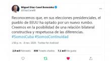 «Reconocemos que, en sus elecciones presidenciales, el pueblo de EEUU ha optado por un nuevo rumbo. Creemos en la posibilidad de una relación bilateral constructiva y respetuosa de las diferencias», escribió el mandatario cubano en referencia al nuevo mandato.