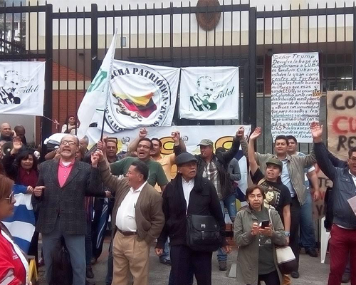 “Cuba y Venezuela no están solas. La revolución se respeta” era una de las consignas que le gritaban los mimebros del Movimiento Colombiano de Solidaridad con Cuba (MCSC), así como organizaciones sindicales y populares de Bogotá.