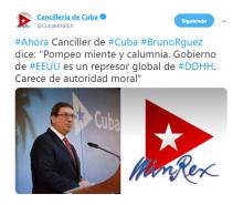 CUBA, 11 de diciembre de 2018- El Ministro de Relaciones Exteriores de Cuba, Bruno Rodríguez Parilla, emitió dos mensajes en la noche de este lunes, a través del usuario oficial de la Cancillería en la red social Twitter, para responder a las acusaciones formuladas por el Secretario de Estado de los EE.UU., Michael Pompeo, contra la Isla en tema de derechos humanos.
