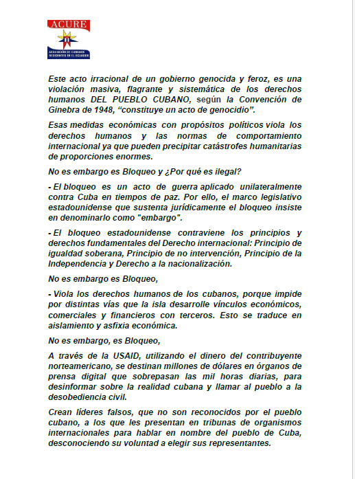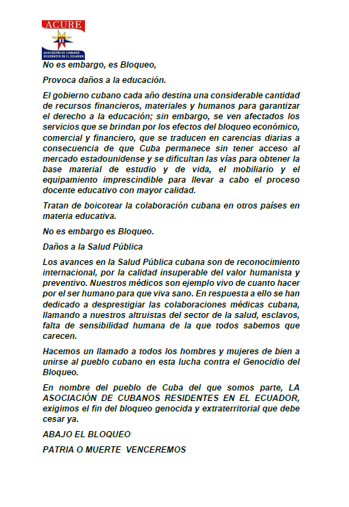 Quito, 28 de octubre de 2025. Compartimos el comunicado de la Coordinadora Ecuatorianana de Amistad y Solidaridad con Cuba, que exige el levantamiento del Bloqueo a Cuba.