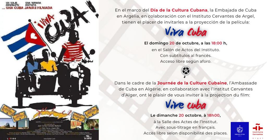 Alger, le 20 octobre 2024. Dans le cadre des activités de la Journée de la culture cubaine, célébrée chaque année au mois d'octobre et culminant avec le jour où a été chanté pour la première fois l'hymne national cubain, symbole de liberté et fierté. Dans ce contexte et 156 ans plus tard, cet héritage continue d'être honoré par des événements artistiques, littéraires et musicaux. Dans ce sens, l'Ambassade de Cuba, en collaboration avec l'Institut Cervantes d'Alger, a rappelé cette date avec la projection du film cubain Viva Cuba.