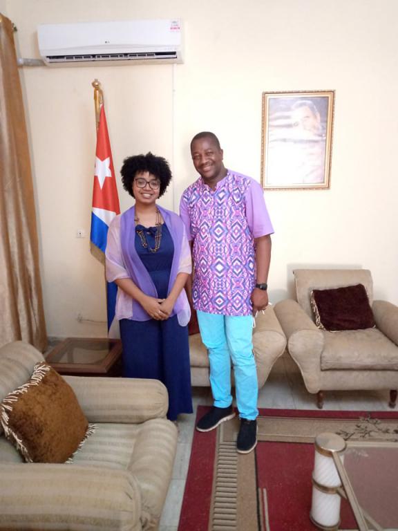 Ce mardi, la Chargée d'Affaires a.i., Alisbel Hechavarría Isaac, a eu un échange avec le Dr. Nouhou Mangue Camara, président de l'Association des étudiants guinéens diplômés à Cuba.