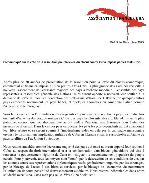 Communiqué de France Cuba sur le Vote contre le blocus à l'ONU