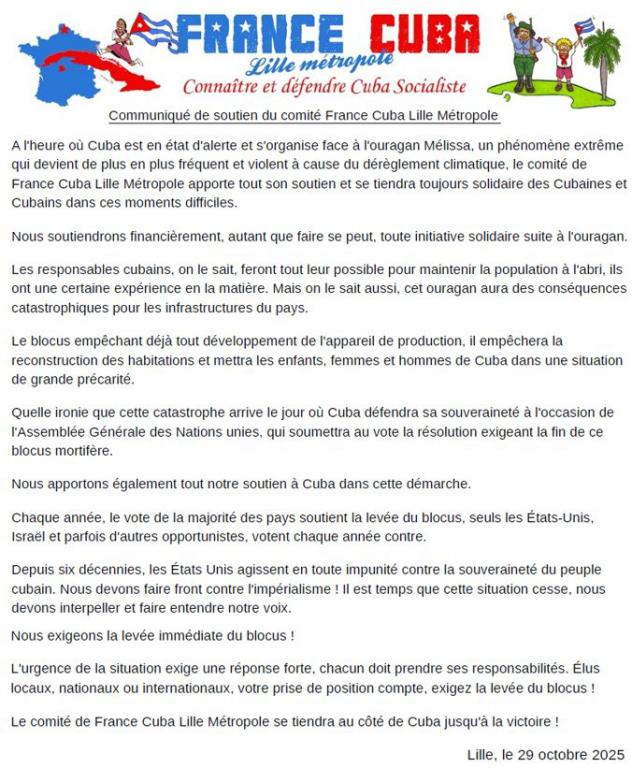 (Extrait) Quelle ironie que cette catastrophe arrive le jour où Cuba défendra sa souveraineté à l'Assemblée Générale ONU, qui soumettra au vote la fin de ce blocus mortifère. Depuis six décennies, les États Unis agissent en toute impunité contre la souveraineté du peuple cubain. Nous devons faire front contre l'impérialisme ! Il est temps que cette situation cesse, nous devons interpeller et faire entendre notre voix. Le comité de France Cuba Lille Métropole se tiendra au côté de Cuba jusqu'à la victoire !