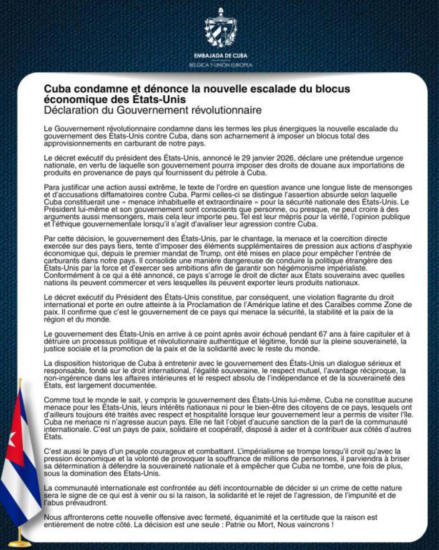 Par cette décision, le gouvernement des États-Unis, par le chantage, la menace et la coercition directe exercée sur des pays tiers, tente d’imposer des éléments supplémentaires de pression aux actions d’asphyxie économique qui, depuis le premier mandat de Trump, ont été mises en place pour empêcher l’entrée de carburants dans notre pays. Il consolide une manière dangereuse de conduire la politique étrangère des États-Unis par la force et d’exercer ses ambitions afin de garantir son hégémonisme impérialiste. Conformément à ce qui a été annoncé, ce pays s’arroge le droit de dicter aux États souverains avec quelles nations ils peuvent commercer et vers lesquelles ils peuvent exporter leurs produits nationaux.