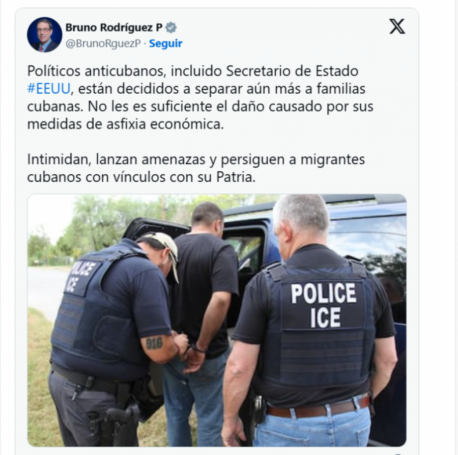 Sur son profil du réseau social X, le ministre des Affaires étrangères a affirmé que « les politiciens anticubains, y compris le secrétaire d'État américain, sont déterminés à séparer encore davantage les familles cubaines ».